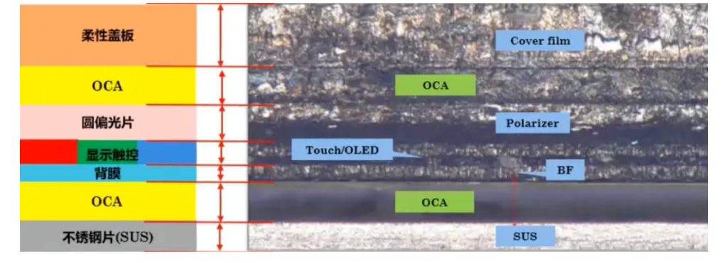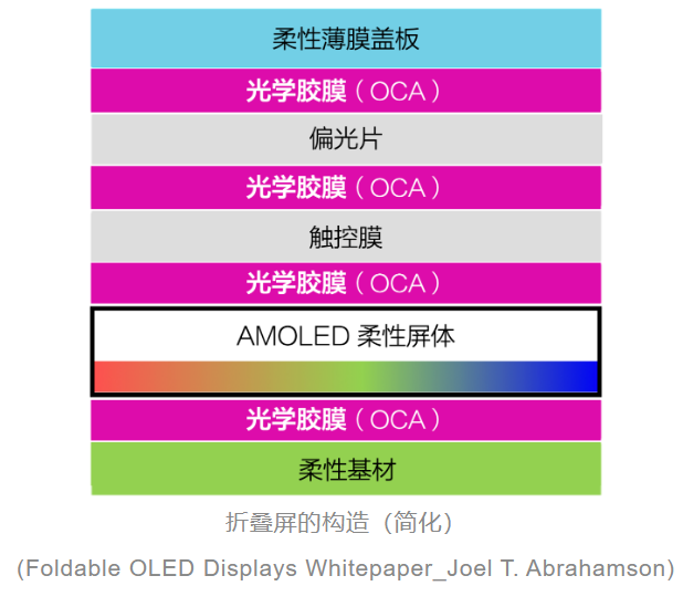 折疊OCA是一種用于折疊手機屏的透明光學元件的特種粘膠劑,在折疊手機屏幕的蓋板層、偏光片層、觸控膜層、OLED層間均有運用。高性能的OCA光學膠是實現可折疊屏的關鍵。